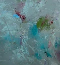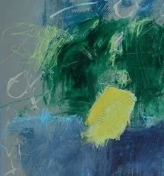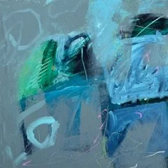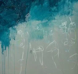 A suite of lyrical and moody abstract paintings exploring a range of blue through layered forms, drawing and surfaces.